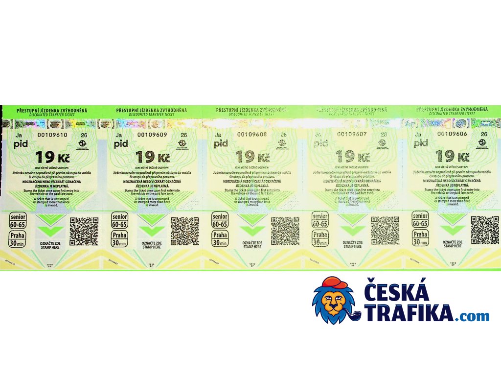 Přestupní jízdenka na 30 minut pro seniory nad 60 let. Platí ve všech prostředcích MHD v Praze (metro, tramvaje, autobusy) v tarifních pásmech PID.