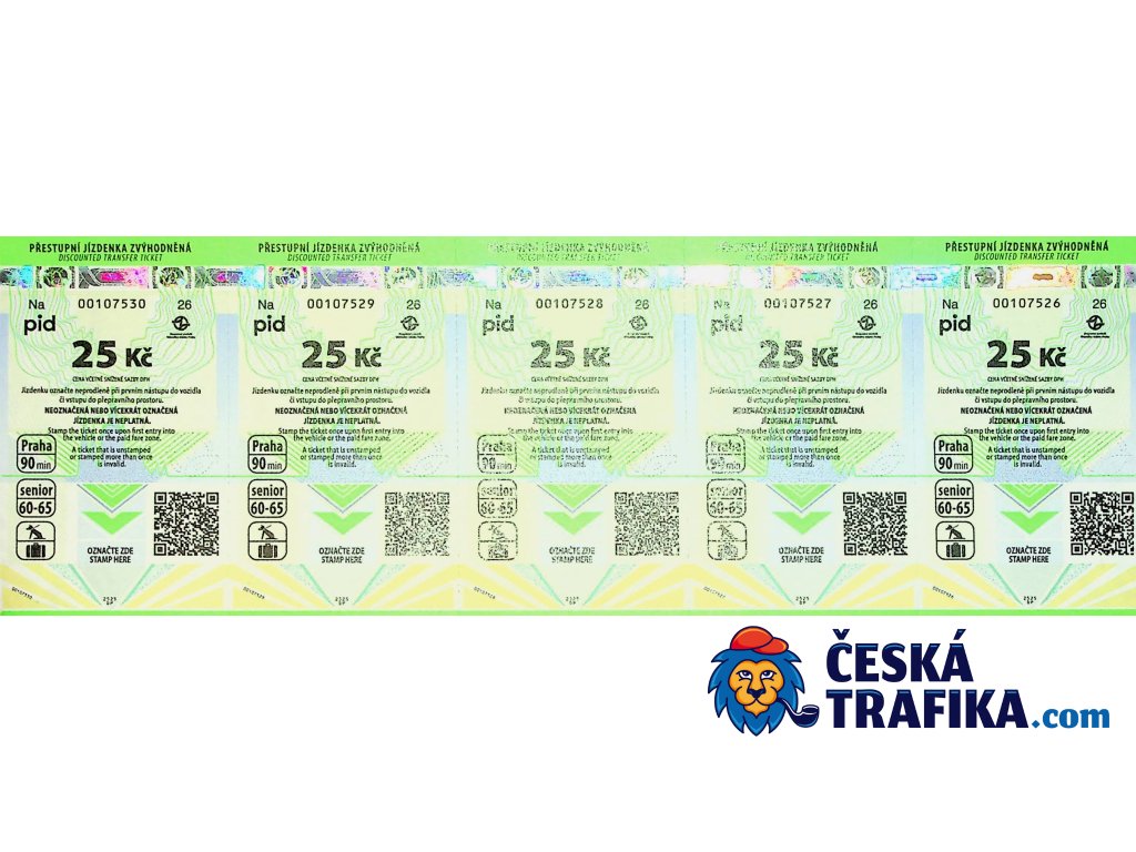 Přestupní jízdenka na 90 minut pro seniory nad 60 let. Platí ve všech prostředcích MHD v Praze (metro, tramvaje, autobusy) v tarifních pásmech PID.