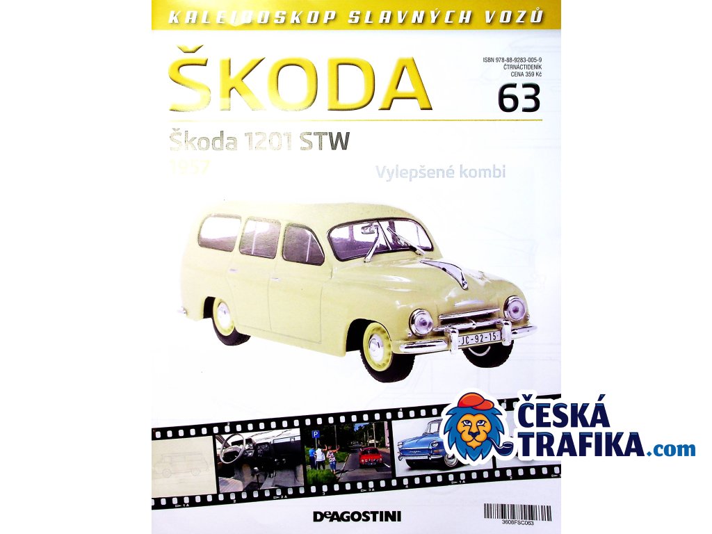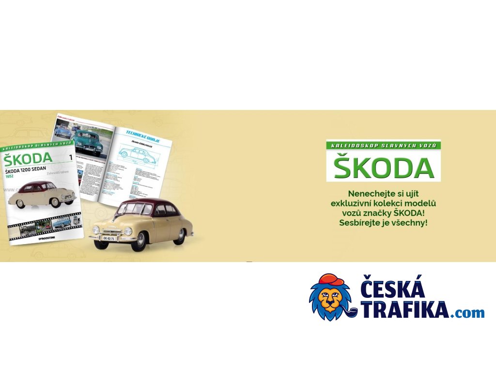 KALEIDOSKOP SLAVNÝCH VOZŮ ŠKODA - POPRVÉ UCELENÁ KOLEKCE Každé číslo kolekce, které vyjde ždy jednou za čtrnáct dní, obsahuje kromě kvalitně zpracovaného kovového modelu vozu Škoda v měřítku 1:43 i přibalený časopis, který obsahuje poutavé články o vozech Škoda (popis, ilustrace, kalendárium a technické údaje). Kolekce doplňuje již dříve vyšlé kolekce Legendárních automobilů minulé éry a Kultovních autobusů minulé éry a přímo také konkuruje, především cenově, modelům značky Abrex❗ Více informací o kolekci naleznete na stránce www.ceskatrafika.com/slavneskodovky Modely nejsou hračky❗ Nejsou určeny dětem mladším 14-ti let❗ Vyobrazení modelu na fotografii eshopu se může lišit do skutečnosti.