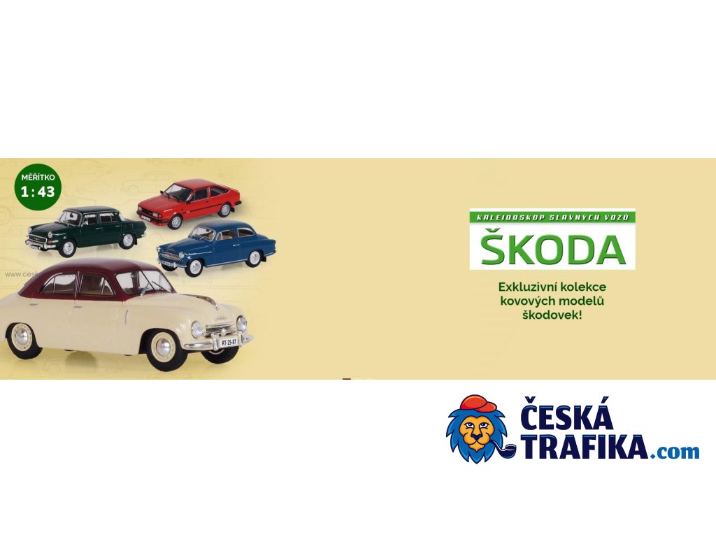KALEIDOSKOP SLAVNÝCH VOZŮ ŠKODA - POPRVÉ UCELENÁ KOLEKCE NELZE OBJEDNAT S MOŽNOSTÍ OSOBNÍHO ODBĚRU, MODEL JE ODESÍLÁN OD EXTRENÍHO PARTNERA POŠTOU. Každé číslo kolekce, které vyjde ždy jednou za čtrnáct dní, obsahuje kromě kvalitně zpracovaného kovového modelu vozu Škoda v měřítku 1:43 i přibalený časopis, který obsahuje poutavé články o vozech Škoda (popis, ilustrace, kalendárium a technické údaje). Kolekce doplňuje již dříve vyšlé kolekce Legendárních automobilů minulé éry a Kultovních autobusů minulé éry a přímo také konkuruje, především cenově, modelům značky Abrex❗ Více informací o kolekci naleznete na stránce www.ceskatrafika.com/slavneskodovky Modely nejsou hračky❗ Nejsou určeny dětem mladším 14-ti let❗ Vyobrazení modelu na fotografii eshopu se může lišit do skutečnosti.