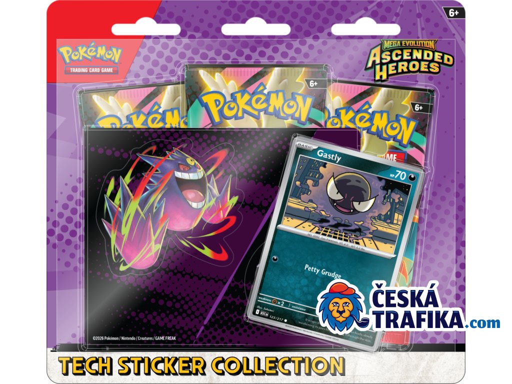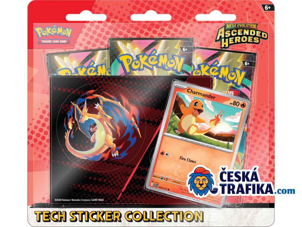 Kromě samolepek získáte i foilovou promo kartu základního Pokémona (Charmander nebo Gastly) a tři booster balíčky, které vám pomohou najít další vzácné karty ze sady Ascended Heroes.