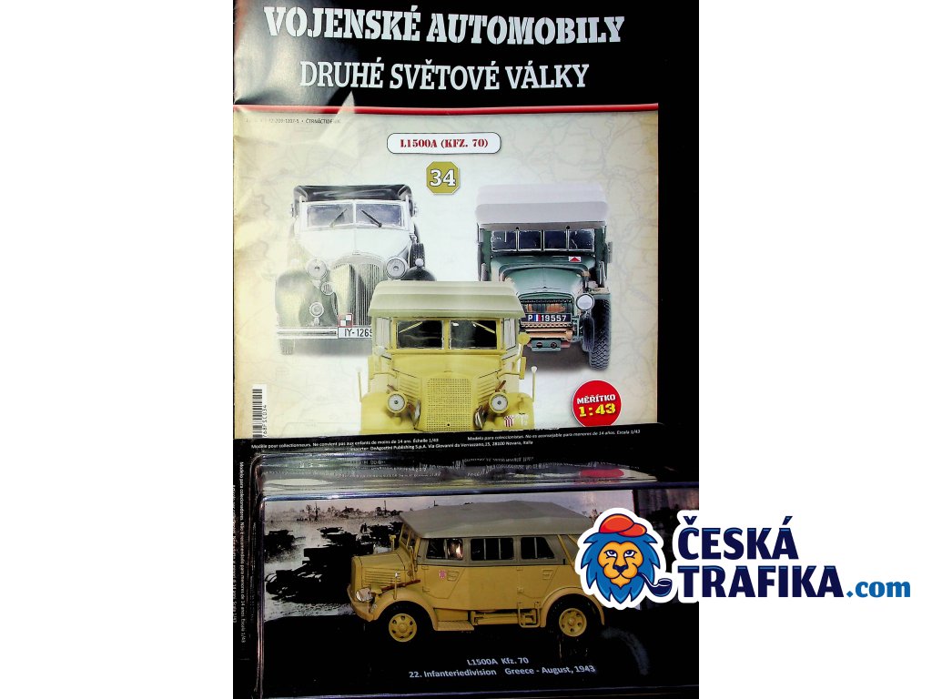 Sběratelský model německého lehkého terénního vozidla Mercedes-Benz L1500A (Kfz.70) v měřítku 1:43 zachycuje verzi nasazenou u 22. pěší divize v Řecku v srpnu 1943. Tento díl č. 34 z edice Vojenské automobily druhé světové války přináší věrnou repliku jednoho z nejrozšířenějších transportních vozidel Wehrmachtu.